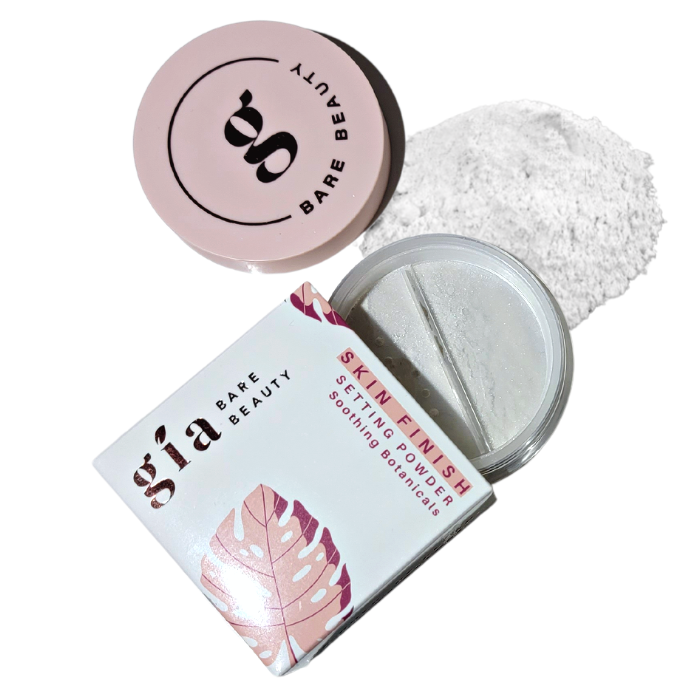 Skin Finish Setting Powder Ingredients: Kaolin Clay, Silk Mica, Zinc Oxide, Serecite, White Tea, *Green Tea, *Jojoba, *Calendula, *Rosemary, Iron Oxides (* Organic Ingredients) Size: 14gr/0.49oz